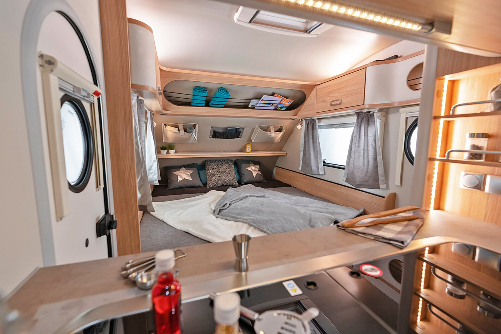 In den kompakten Abmessungen der Touring Wohnwagen ist naturgemäß nicht viel Raum. Die große Mehrheit der Reisecaravans ist daher für zwei Personen ausgelegt. Für die ist alles an Bord: Ein Toilettenraum mit Waschbecken, eine Küchenzeile mit Herd und Kühlschrank, Sitzgelegenheit und Schlafplatz. Toilettenraum und Küchenblock fallen eher zweckdienlich aus. Meist gibt es entweder eine geräumige Sitzgruppe, die Abends zum Bett umgebaut wird, oder ein festes Doppelbett und dafür nur eine kleine Sitzecke für zwei Personen. Mehr ist auch nicht nötig, denn im Sommer findet das Campingleben tagsüber ohnehin vor dem Touring Wohnwagen statt.