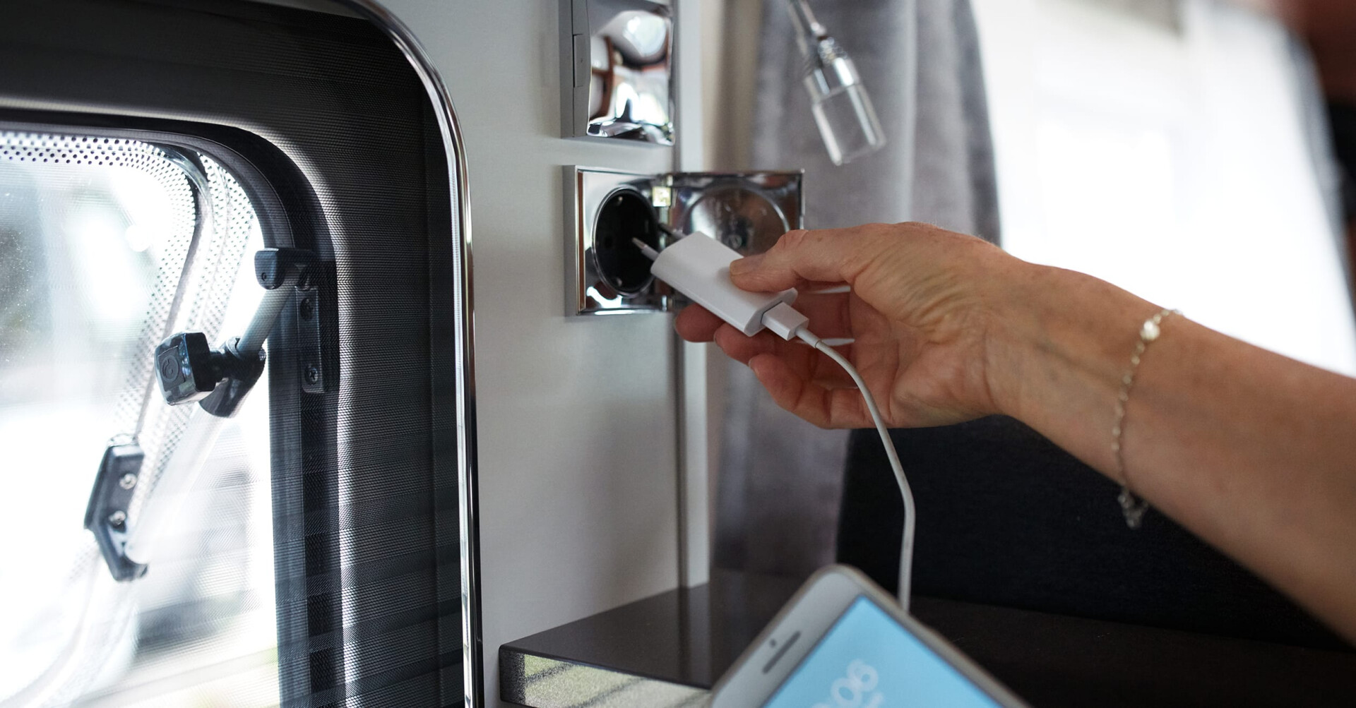 Dank der Stromversorgung in Caravan oder Reisemobil können elektronische Geräte wie zu Hause genutzt werden – ob Kaffeemaschine oder Smartphone.