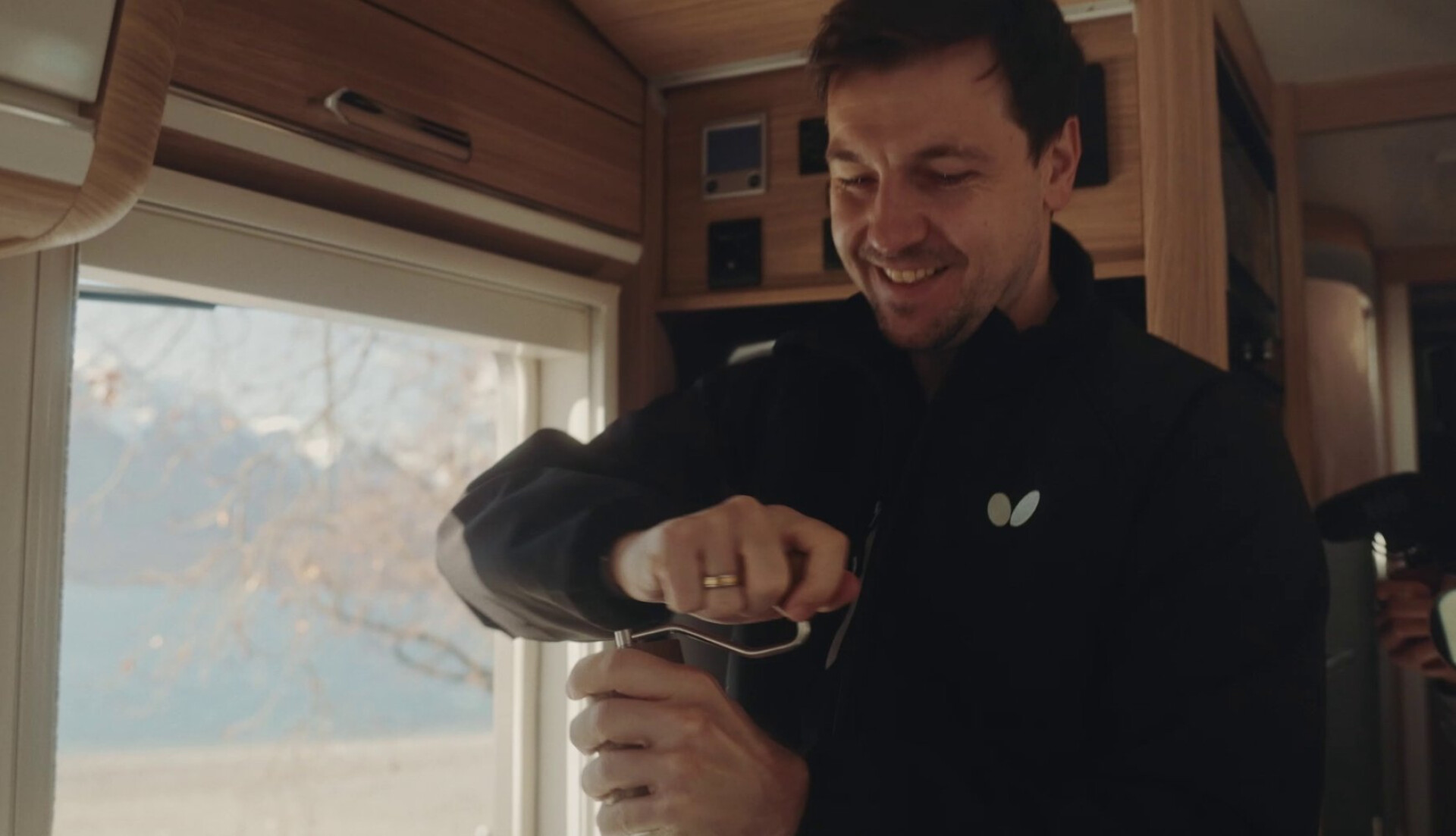 Dabei erleben wir ihn vor dem großen Spieltag ganz entspannt in seinem Reisemobil vor der Turnierhalle. Hier findet er vor großen Wettkämpfen Zeit für einen Plausch mit anderen Spielern – und das am liebsten bei einer guten Tasse Kaffee. Dabei ist Timo penibel bei der Zubereitung: 16 Gramm Kaffeebohnen für 250 ml Kaffee versprechen für den selbsternannten „Kaffee-Nerd“ optimalen Genuss. Mehr über Timos Kaffee-Liebe, und wie er sich beim Turnier schlägt, erfahrt ihr in der zweiten Episode von „Unterwegs mit Timo Boll“.