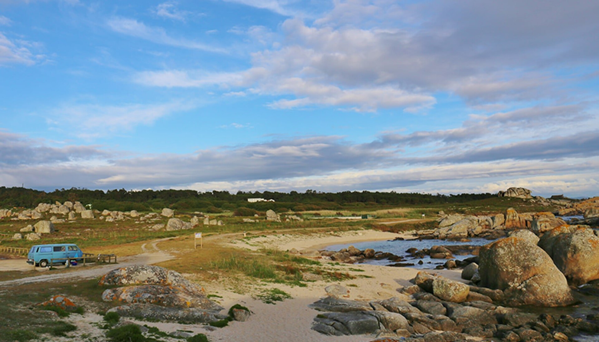 Wenn Sie sich die Zeit nehmen oder sogar den Zufall die Reiseregie führen lassen können, werden Sie entlang der spektakulären spanischen Nordwestküste unzählige Stellplätze finden, die Sie am liebsten gar nicht wieder verlassen wollen. Wie etwa Péton con Negro: Die kleine Felsformation an der galicischen Südwestküste westlich von Pontevedra ist der markanteste Punkt in dieser von winzigen Buchten und geschützt gelegenen Stränden geprägten Landschaft. Es sieht aus wie in den schwedischen Schären. Problemlos lässt es sich hier baden. Der nächste Ort ist das Feriendorf San Vicente do Grove, rund drei Kilometer entfernt. Und der Sandparkplatz direkt am auch für Hunde erlaubten Strand ist der ideale Schlafplatz im Wohnmobil.