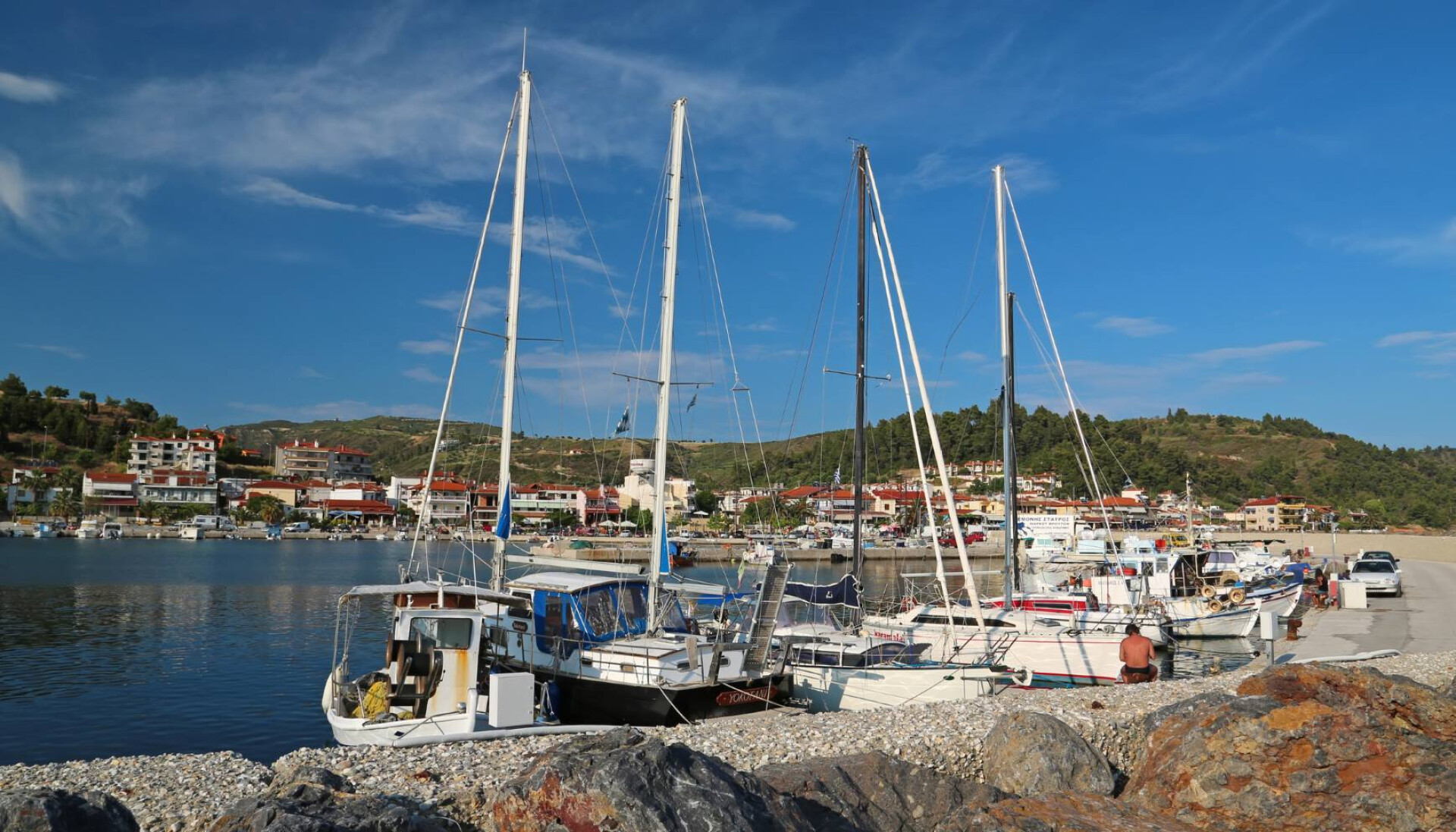 Von Sithonia nach Athos führt nur eine zweitrangige, aber bestens ausgebaute Straße. Zuerst entlang der Küste, später durch die Berge, um bei Ierissos wieder auf das Meer zu treffen. Unser elektronischer Wetterfrosch verspricht uns für morgen Sonne. Unserem Schiffs-Ausflug entlang der Mönchsrepublik steht also nichts im Wege.