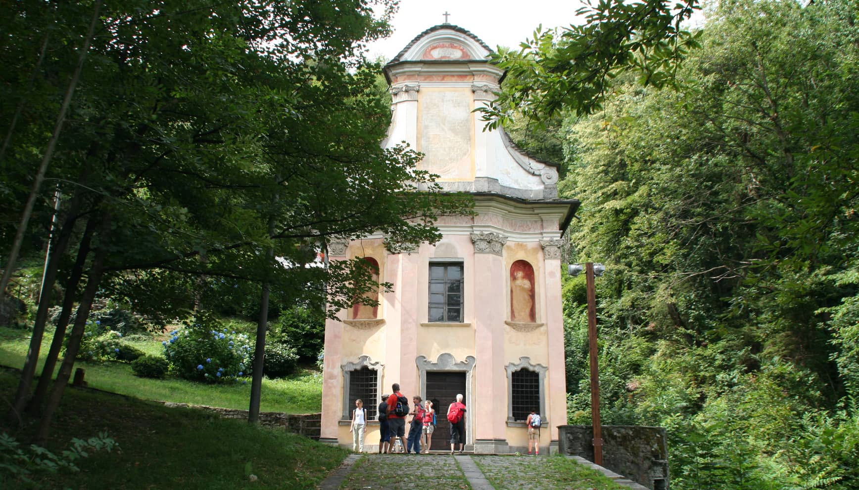 Vom Zentrum der mittelalterlichen Stadt Domodossola aus, geht es auf die Erkundung des Heiligen Kalvarienbergs (Sacro Monte Calvario). Hier am Hügel von Mattarella erlebt man mehr als 1500 Jahre Siedlungsgeschichte und damit verbunden auch religiöse Geschichte. Die strategische Position des Hügels machte ihn zum militärisch heiß umkämpften Punkt. Nach der Besatzung und Zerstörung durch Schweizer Heere waren es im Jahr 1656 zwei Kapuzinermönche, die die Idee hatten, den Hügel in ein Bollwerk des christlichen Glaubens zu verwandeln. In verschiedenen Bauphasen wurden nach und nach 15 Kapellen errichtet, ausgestattet mit Holz- und Steinfiguren verschiedener Künstler – finanziert durch Gaben Gläubiger aller Schichten. Seit 1991 ist der Heilige Kalvarienberg Naturschutzreservat und zählt seit 1993 zum UNESCO-Weltkulturerbe. Die Bewältigung der Höhenmeter von der auf 280 Metern übrigens niedrigst gelegenen Stadt der Alpen, hinauf auf 420 Meter ist über die gepflasterte Steinstrasse ein Kinderspiel. Wer daher weiterlaufen möchte wählt die etwa 8 km lange Wanderung auf dem Weg der Weinpressen und Mühlen (Via dei Torchi e dei Mulini) zum Agriturismo Zaretti. Nach einer Stärkung mit Salumi, Speck, gebackenen Zucchiniblüten und Formaggi, kann man auf der Via del Mercato nach Masera und Trontano spazieren und von dort mit der kleinen Vigezzina-Bahn durch Wein- und en nach Domodossola zurückkehren.
