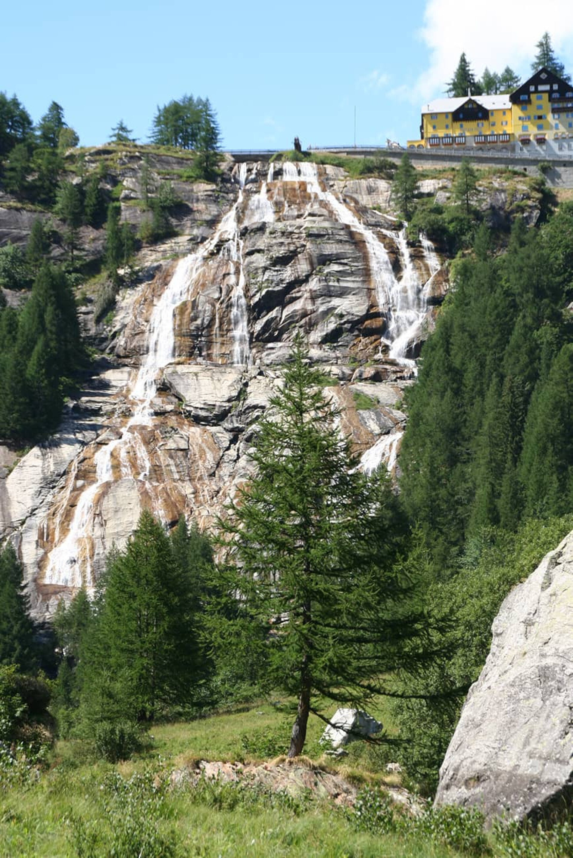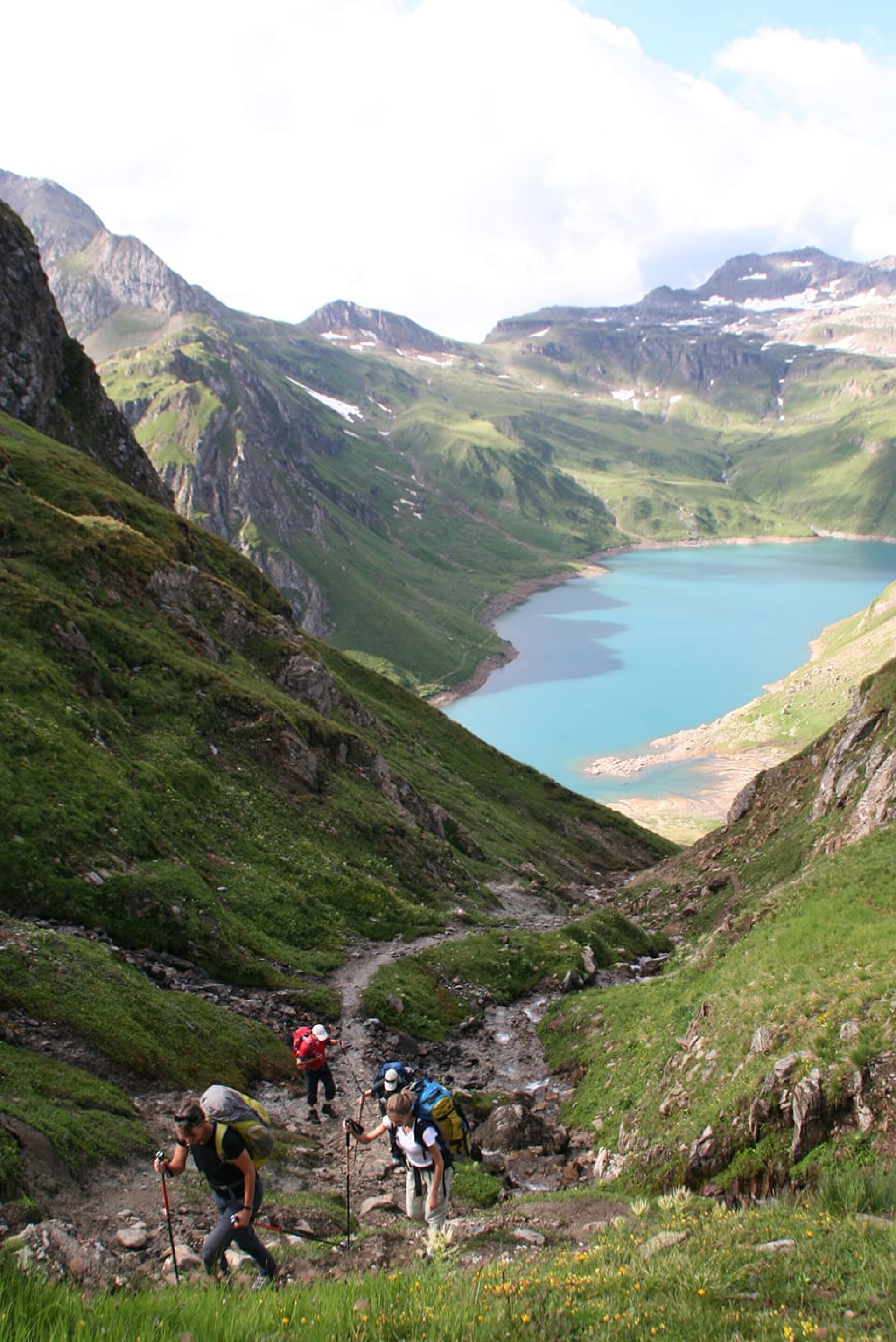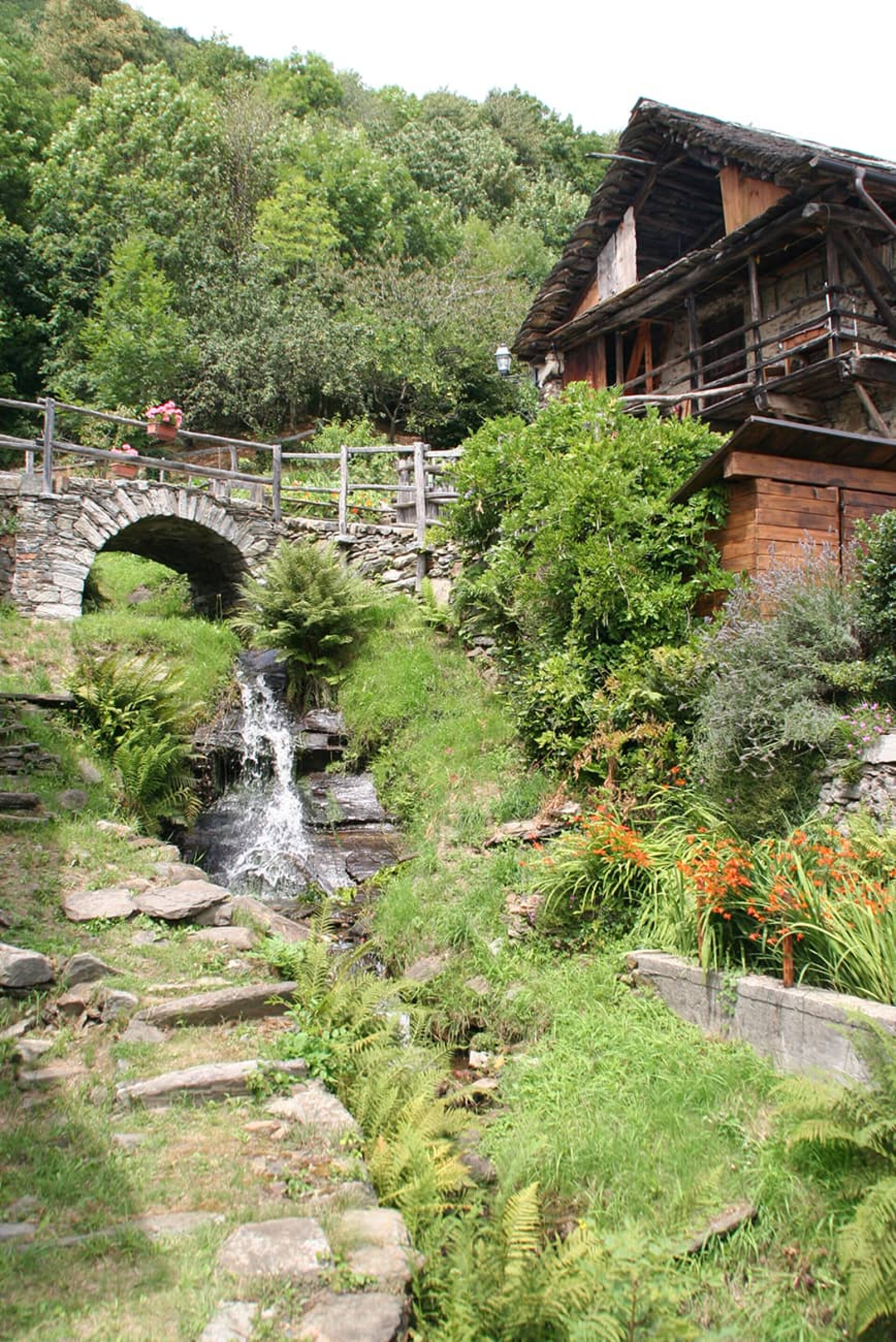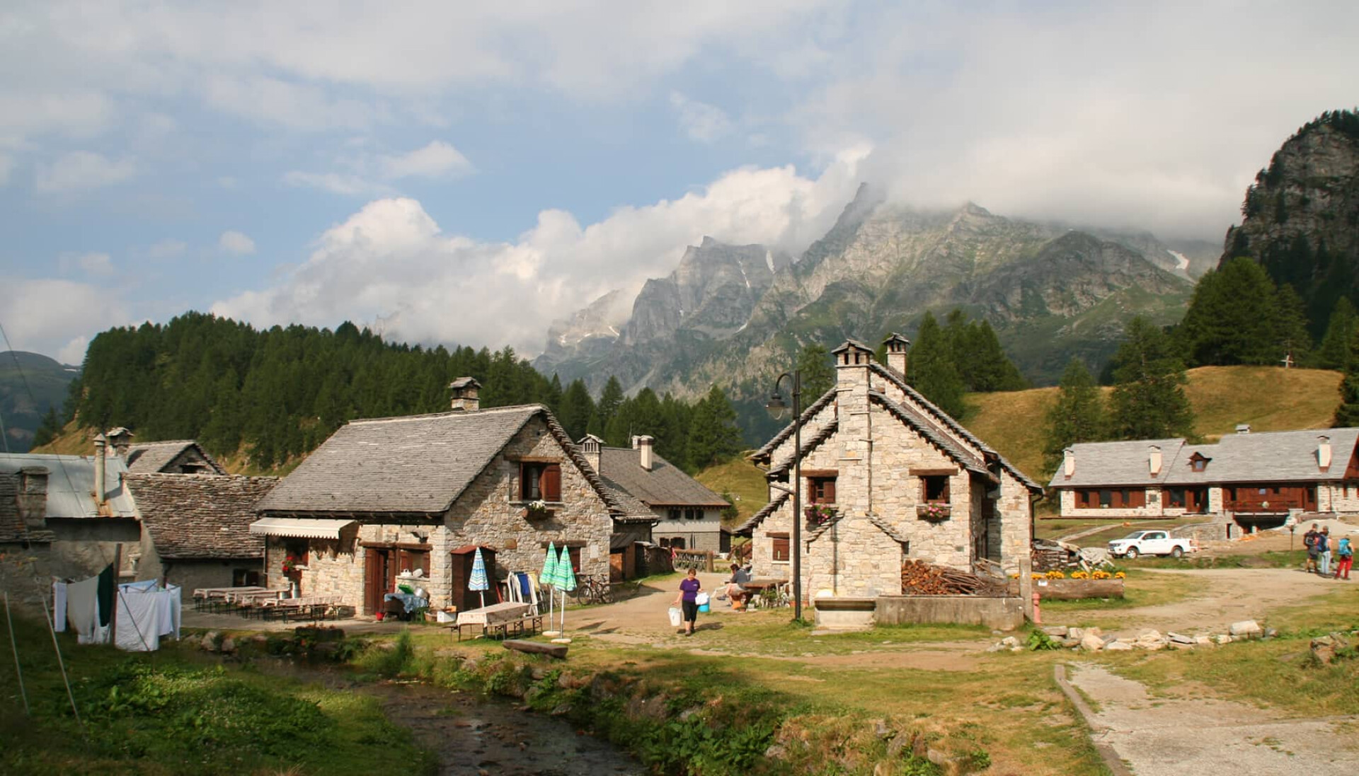 Noch einmal wird es stramm: Der Anstieg bis zum Passo Nefelgiu auf 2.583 m und somit dem höchsten Punkt der Überquerung, ist von Beginn an steil. Dennoch macht es einfach Spaß, sich immer wieder einmal zurück zu wenden, den See unter sich liegen zu sehen und die weit entfernten Berge, die tags zuvor gemeistert wurden. Die 390 m ↑ Höhenmeter sind relativ schnell in einer Stunde geschafft. Auch hier liegt die Schwierigkeit eher im Abstieg, der mit 855 m ↓ m in einer Zeit von rund drei Stunden bewältigt werden kann. Wir wählen am Schluss den serpentinenartigen Weg hinunter zum Stausee Lago di Morasco um uns dort hinter den Staumauern im Bachbett die Füße zu erfrischen. Die 10,5 km lange Strecke mittleren Schwierigkeitsgrads endet in Riale (1.731 m), einem kleinen Bergdorf, das mit seinen zauberhaften Holzhäusern wie aus dem Bilderbuch zu stammen scheint.