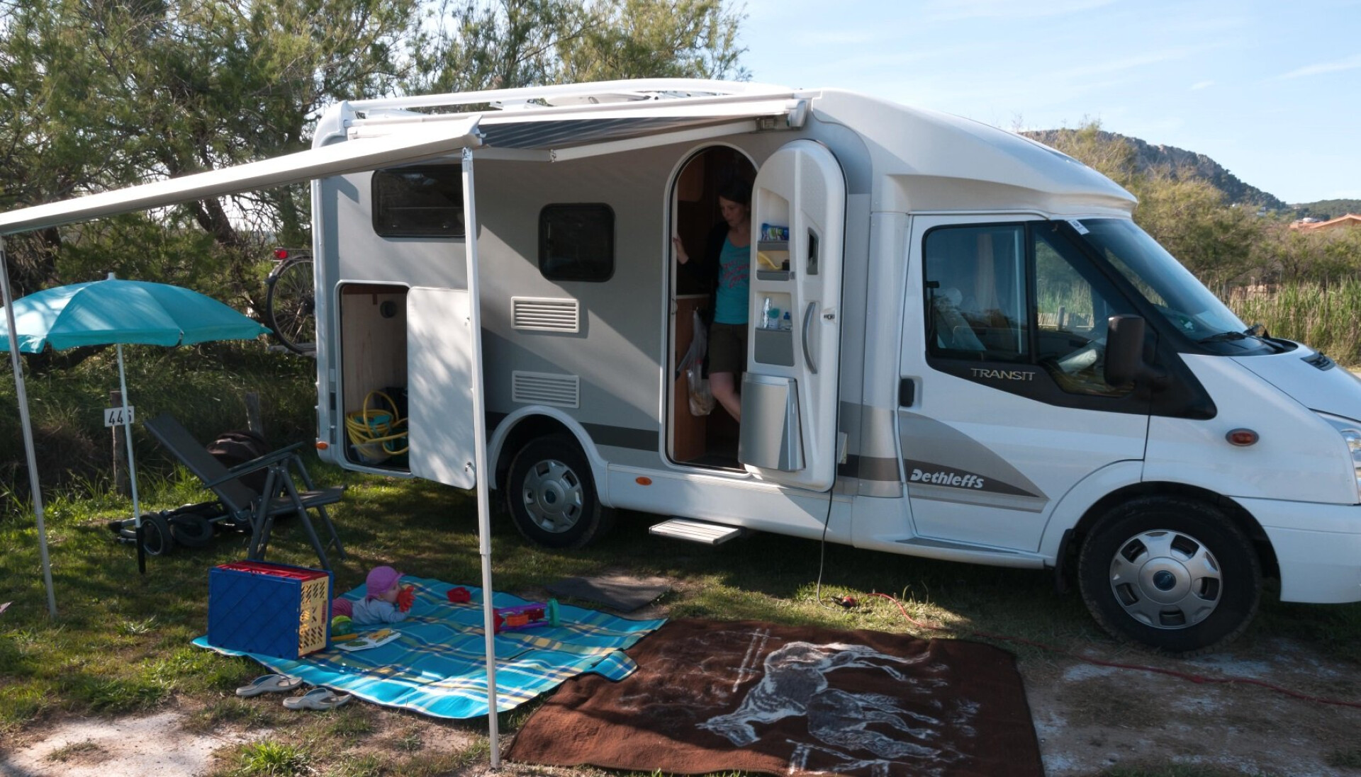 Wir hatten einen sechs Jahre alten Teilintegrierten auf Fordbasis. Mit knapp sechs Metern Länge aus unserer Sicht vollkommen ausreichend. Und nein: keine Spezialumbauten, kein Solar auf dem Dach, und kein extra Wassertank. Eine große Heckgarage war uns wichtig. Und ein Fahrzeug, dass noch genug Zuladekapazität aufweist. Mit Kleinkind fährt man eh nicht in die entlegensten Winkel. Als Kinderbett haben wir ein leichtes Babybett von Babybjörn auf die Sitzgruppe gestellt.
